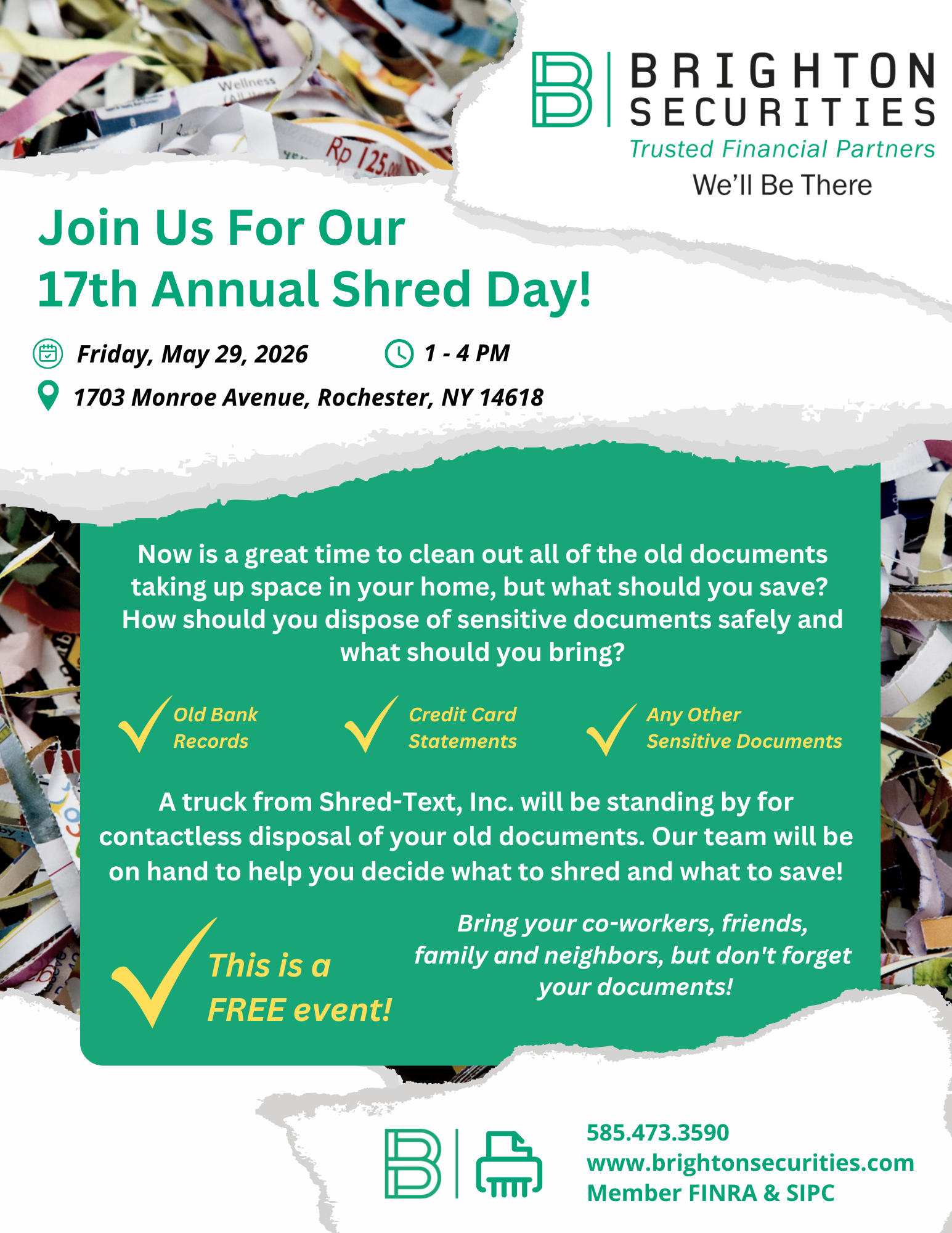 ✅ Please enter our front parking lot via our side entrance on Glen Ellyn Way, Brighton, NY 14618 closest to our Tax Department Entrance and exit onto Monroe Avenue, for safety purposes. (Our teammates will be helping direct traffic & shred your documents—just look for the Brighton “B” on their attire!)